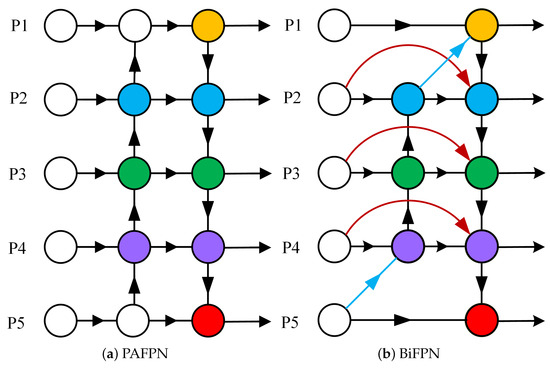 Compared to PAFPN, BiFPN can enhance network feature fusion through a simple residual operation by adding a residual link to the original feature. This strengthens the network’s representation ability. At the same time, BiFPN recognizes that input feature maps of different scales have varying contributions to the network. Therefore, single-input edge nodes that contain less information and have lower contributions to feature fusion are removed from the PAFPN network. This reduces the computational overhead and allows for the better adjustment of each scale feature map’s contribution by increasing the weight value after fusion, thereby improving the network’s detection speed.