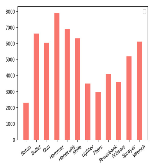 Class distribution of the PIDray dataset. The red bar represents the number of each class in the PIDray dataset.