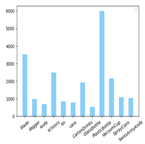 CLCXray was jointly constructed by Tongji University, Beijing University of Posts and Telecommunications, and the University of the Chinese Academy of Sciences. It contains 9565 X-ray security images in 12 categories, including five types of knives (blades, daggers, knives, scissors, Swiss Army knives) and seven types of liquid containers (cans, beverage cartons, glass bottles, plastic bottles, vacuum cups, spray cans, tin cans). The distribution of each class is shown in Figure 8. In our experiment, we used 6696 images as the training set and 2869 images as the test set. Our partitioning of the modified dataset was consistent with that of PIDray.