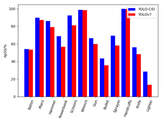Figure 9 compares the detection accuracy of each category between YOLO-CID and the original YOLOv7 algorithm on the PIDray dataset. As shown, the detection accuracy of our proposed algorithm is higher than that of the original YOLOv7 for all categories. In particular, the detection of lighters, sprayers, and knives has been significantly improved compared to the original model.