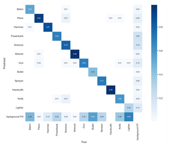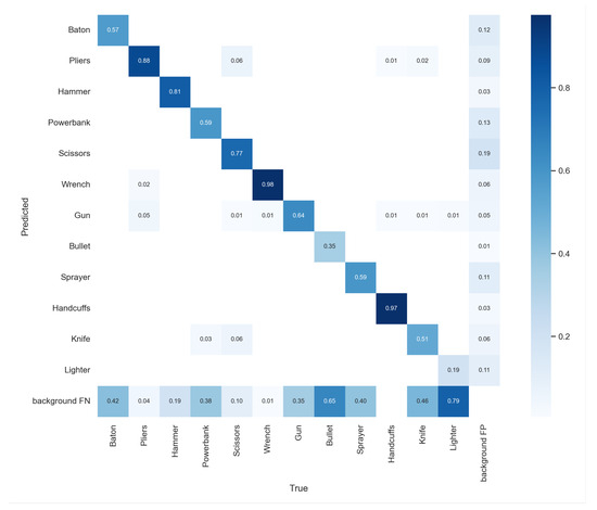 Figure 10 presents the confusion matrix for the PIDray dataset using the YOLOv7 model, while Figure 11 displays the confusion matrix for the same test set using the YOLO-CID model. A comparison of the two figures reveals that the detection accuracy for each class has been significantly improved with the YOLO-CID algorithm relative to the original algorithm. This suggests that the YOLO-CID model places greater emphasis on feature information and exhibits superior performance.