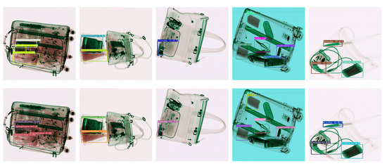 Some examples of the detection result on the test set of the PIDray dataset. The first row is the result of YOLOv7, and the second row is the result of YOLO-CID. We used the same four images to compare the performance of the detection models.