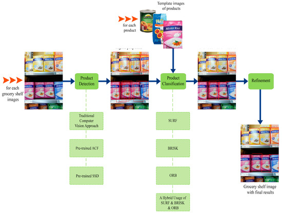 The role of an automatic product recognition system is to find the location and class of products on a given shelf image from groceries. A hybrid method for the multi-stage end-to-end recognition of grocery products in shelf images was offered in this study. The process of product recognition begins with the product detection; then, the process classifies products and, finally, concludes with refinement. An automatic product recognition system offers numerous benefits to producers, suppliers, and customers. On the producers’ side, producers desire their products to be properly placed in the markets shelves according to the layout (planogram). According to the results of [1], sales rose by 7.8% and profit rose by 8.1% within two weeks when the optimized planogram was perfectly matched. To ensure the planogram compliance, the general procedure is manually controlled by employees by confirming the compatibility of the photos taken in the markets with the planogram at regular intervals. However, this manual process is prone to human mistake and needs non-negligible person-hours. On the suppliers’ side, automatic product recognition is useful for stock tracking, the replenishment of inventory, and planogram compliance. In particular, the necessary information for the management of supermarkets is provided in real time. The obtained information from an automatic product recognition system makes it possible to increase sales by identifying the products that are out of stock or misplaced and improving the customer experience by analyzing the shopping patterns. The research about out-of-stocks [2] also shows that 31% of the customers who cannot find the requested item on the shelf buy the same product from another grocery store, 22% buy the different brand of the same product, and 11% give up the product when they cannot find it. On the customers’ side, a successful product recognition system makes it possible for customers find the product they are looking for faster, to obtain help with in-market navigation, and to make price comparisons easier. It also provides a more comfortable shopping experience for visually impaired customers. When evaluated in terms of all stakeholders, product recognition creates a solution that saves time, increases sales [1], and increases customer satisfaction [3]. However, product recognition has specific challenges to handle, as shown in Figure 1. In addition to the familiar computer vision difficulties (scene complexity, blurring, irregular lighting conditions, different viewing angle, etc.), other significant challenges are also encountered in recognizing the products on the grocery shelves, such as different shelf designs, different product sizes, constantly changing product packaging, high packaging design similarity among different product types, and the high number of product classes. Therefore, an effective product recognition system is required to obtain a satisfactory performance for all different parties benefiting from such an approach.