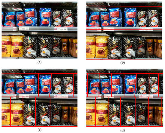 The steps of the proposed traditional computer vision approach in Stage-1: (a) original shelf image; (b) shelf image with detected shelf lines after first step; (c) shelf image with detected product regions after second step; (d) shelf image with completed product regions after third step.