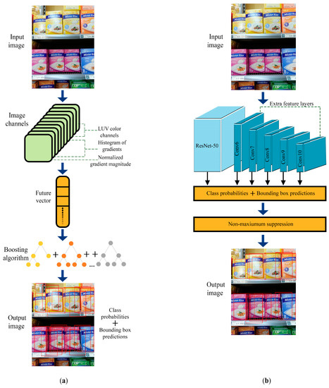 The second proposed method uses the ACF [4] (see Figure 4a for the flow diagram) for Stage-1. A normalized gradient magnitude, a histogram of oriented gradients (six channels), and LUV color channels (total: 10 channels) were computed to represent a feature vector of the input image, and then a boosting algorithm was used for classifying the image. The ACF and its different implementations have achieved good performance in some detection problems such as the detection of humans [57], locusts [58], aircrafts [59], and cross-sectional areas of the fetal limb in an ultrasound image [60]. Although ACF has not been used for product recognition before, it is expected that having good performance for recognizing objects with similar properties can lead to a sufficient performance while creating region proposals for products that are similar to each other.