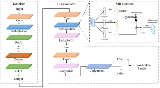 The network structure of SADAN is shown in Figure 4. Its Denoiser and Discriminator both consist of a convolutional neural network and a self-attention mechanism. The Denoiser compensates for the loss of some keyboards’ EM information due to the deconvolution layer, which helps to better restore the already very weak effective signal in the leaked signal.