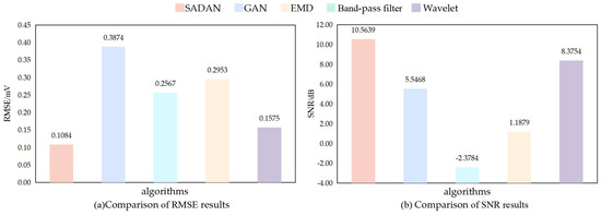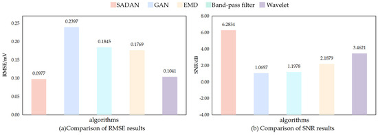 The comparison experiment was consistent with the simulated experiment, compared the GAN, EMD, band-pass filter, and wavelet threshold denoising. The evaluation metrics also used RMSE and SNR. The results in Figure 7 show that SADAN has the best retention of effective information and the largest SNR improvement in the denoising process.