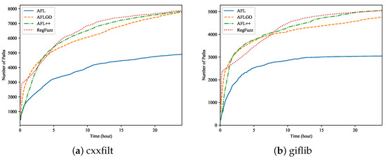 The path coverage results and code line coverage results of each fuzzer on different programs are shown in Table 3 and Figure 3. We can see that RegFuzz does not have the limitation of directed fuzzing since its performance is much better than the directed fuzzer AFLGo. Overall, RegFuzz is nearly consistent with AFL++ in path coverage and code line coverage. In terms of path coverage, RegFuzz is nearly 40% higher than its base fuzzer AFL and 15% higher than AFLGo. AFL++ combines the advantages of other excellent fuzzers (MOPT, AFLFast, etc.). It also has a more complicated seed mutation strategy and higher running speed. So, it performs very well in coverage. In almost all the programs that were tested, AFL++ is in first or second place. RegFuzz’s seed prediction model plays an important role in directed fuzzing, and its path coverage is much higher than AFLGo’s. In all seven program evaluations, the overall average path coverage of RegFuzz is 15% higher than that of AFLGo, and the average code line coverage is about 2% higher. This is because AFLGo is a directed fuzzing fuzzer. It does too many invalid mutations and tests near the target basic blocks. However, when RegFuzz performs directed fuzzing on target code blocks but does not catch any crashes or new coverage, the label weight of the seeds over a short distance is reduced, and according to the seed prediction model, seeds will be tested at a large distance from the target code, which improves the performance of directed fuzzing. In terms of code line coverage, RegFuzz has the highest code line coverage in cxxfilt, libxml2, and lrzip, and AFL++ has the highest code line coverage in the other four programs. Although AFL++ shows the best line coverage in a higher number of programs, it only has a small lead over RegFuzz. Therefore, based on the coverage experiment results, RegFuzz has good coverage performance.