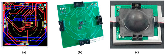 The sensor cell PCB design and the assembled electronic board can be observed in Figure 3. Figure 3a represents the circuit design created using Altium software, Figure 3b showcases the two-layer green laminated board, and Figure 3c depicts the sensor cell enclosed within the sensor sheet.