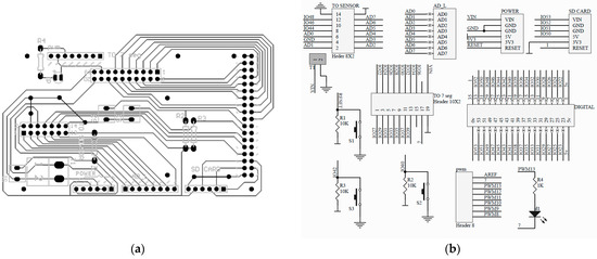 Circuit design of the master board: (a) the PCB; (b) the schematic.
