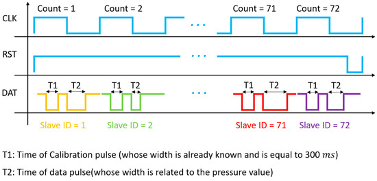 Notably, because the AT-tiny13A microcontroller lacks a crystal clock, it cannot communicate flawlessly via a serial network. Small oscillator timing fluctuations can result in data loss; hence, each slave returns two data points every round. The first is constant data (low-level voltage) with a 300-microsecond length, and the second is data (second low-level voltage) whose duration is dependent on the output value of the sensor cell. Consequently, the master measures the pulse width using accurate internal clocks. As previously explained, for each slave, two pulses are created; the first pulse is used for calibration, and the second is utilized to record the selected sensor cell pressure measurement. Figure 5 depicts the chronology of the proposed network protocol.
