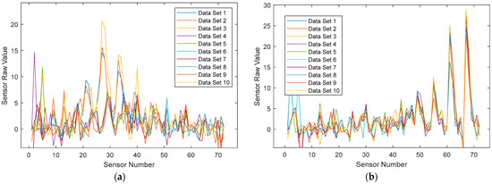 Measurements obtained from each sensor during multiple tests: (a) the 1 kg load in position 6; (b) the 5 kg load in position 10.