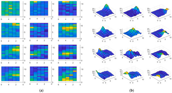 In order to assess the repeatability of the data and calibrate the sensor sheet, scales ranging from 1 to 5 kg were positioned in 12 distinct locations atop the mattress. Each position was examined 10 times, resulting in 72 sensor cell data values per examination. As a result, 600 tests were run, from which 43,200 data points were gathered. Figure 6 and Figure 7 depict a few of these test outcomes. In particular, Figure 6 depicts repeated data taken from each sensor throughout numerous tests; Figure 6a corresponds to the 1 kg load in position 6, and Figure 6b corresponds to the 5 kg load in position 10. Figure 7 depicts the mean results from several testing for 12 unique sites on the mattress, with Figure 7a exhibiting the top view of the 1 kg weight, and Figure 7b depicting the 3D image of the 5 kg load. These typical graphs demonstrate the dependability and consistency of the sensor sheet.