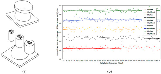 A test was developed for each sensor cell in order to examine the repeatability of the sensor output voltage, checking the output voltage with scales ranging from 100 gr to 500 gr. Signals were subjected to appropriate low-pass filters according to the results. The reactions to varied loads are illustrated in Figure 9 as a depiction of these outcomes.