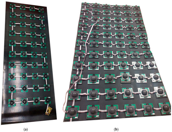 (a) Completed sensor sheet with 4 × 10 sensor array. (b) The same sensor sheet with extended dimensions and 6 × 12 sensor array.