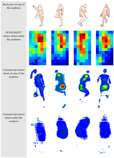 In Figure 11, for four representative poses of a volunteer, the findings are compared between a SENSOMATT sensor sheet and a commercially available flexible piezoelectric sensor sheet with an array of 27 × 64 components, with each sensor having a normal range of 0 to 100 mmHg for use in mattress applications. Visibly, when the commercial sensor sheet is placed on top of the mattress, the pressure results are satisfactory, while, when it is placed underneath the mattress, there is no way to detect the body organs, maximum pressure, or even the attitude.