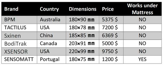 While the SENSOMATT sensor sheet demonstrated promising results, it is important to acknowledge its limitations and areas for improvement. One limitation could be the cost associated with the production of the sensor sheet, which may hinder its widespread adoption. Future research could focus on optimizing the manufacturing process to reduce costs without compromising the sheet’s performance. Despite the SENSOMATT sensor sheet being the most affordable product in the market regarding cost, as depicted in Figure 12, there is still a necessity for further cost reduction. Additionally, the calibration process for different mattresses could be further streamlined to enhance user convenience. Exploring alternative materials or incorporating advanced sensing technologies could also be potential avenues for future development.
