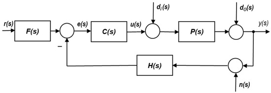 Figure 2. A two-degree-of-freedom feedback control loop.are the inputs and are the outputs.Frequency-domain performance specifications have a general form:where is the considered transfer function, is the upper limit of its magnitude, and is the set of frequencies from a selected range.The individual inequality specification types include:Type 1—Stability specificationType 2—Complementary sensitivity specificationType 3—Sensitivity or plant output disturbance specificationType 4—Plant input disturbance specificationType 5—Control action reduction specificationType 6—Reference tracking specification. - Calculation of QFT bounds.Every plant in the template as well as the compensator can be expressed in their respective polar form:QFT bounds are calculated from the control specifications and consider model uncertainty. By substituting the polar forms (26) into individual selected performance specification types, they can be rearranged into quadratic inequalities in the form:where the coefficients are functions of and .Using an appropriate algorithm [20], the quadratic inequalities (27) are solved and translated into a set of curves in the Nichols diagram for each frequency and specification type. Thus, at each frequency and for each specification there is a bound that can be dashed or solid, depending on whether the area satisfying the bound is above or below the line.