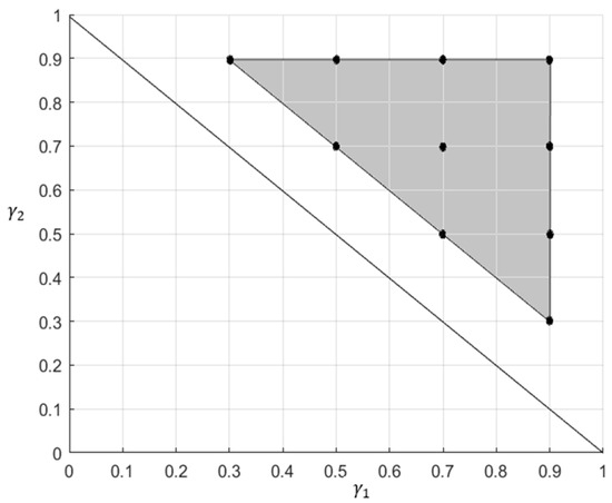 When considering the minimum phase plant configuration, the two uncertain parameters are interrelated according to (34). The set of realizations of the uncertain plant was generated by gridding and considers all their combinations that meet (33). The number of feasible combinations is . The corresponding combinations specifying the considered uncertainty region are depicted in Figure 4. The nominal model was selected as (38) evaluated in