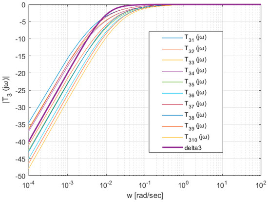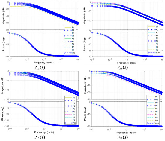 To appropriately choose the frequency range for the controller design, the Bode diagrams of the individual entries of (38), considering the settings in Table 2, are depicted in Figure 5.
