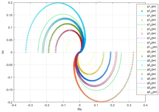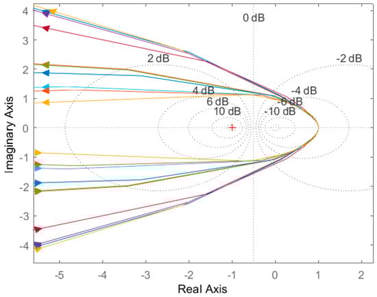 - verification of the fulfillment of the performance requirements in the equivalent subsystems by plotting Nichols plots of open-loop equivalent subsystems for r = 1, …,10 to (Figure 12),