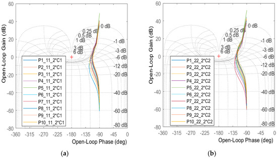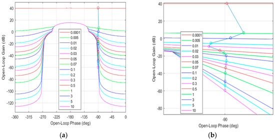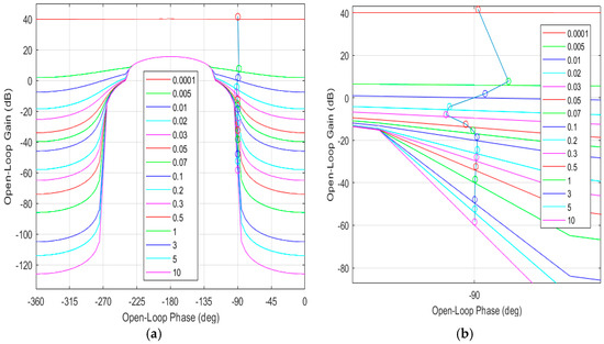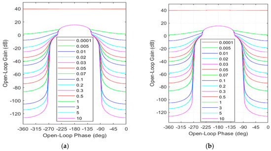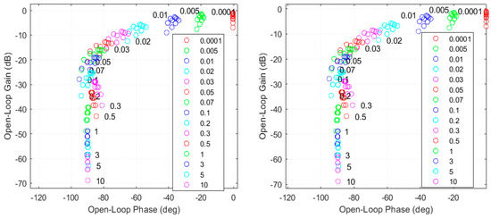 For both equivalent subsystems, Nichols diagrams in Figure 12 prove stability and fulfillment of the Type 1 specification (40) since neither of the depicted Nichols plots intersects or touches the curve of the value corresponding to .