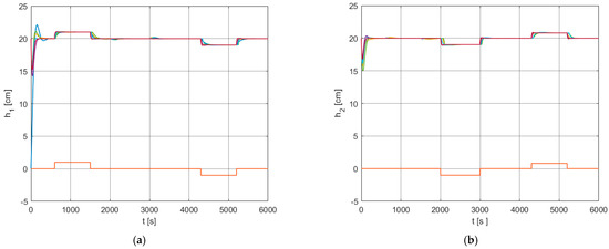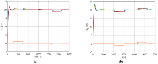 Time domain analysis is based on simulations of step changes in references of the lower tanks according to scenarios depicted in the lower parts of the charts in Figure 15 and Figure 16. Simulations were performed using both the linear and the nonlinear models (36) and (33), respectively, in the specified working point for all 10 valve settings , according to Table 2. Respective output responses are depicted in Figure 15 (linear model) and Figure 16 (nonlinear model); the performance on individual charts is of interest only after the variables have first settled at the respective working points.