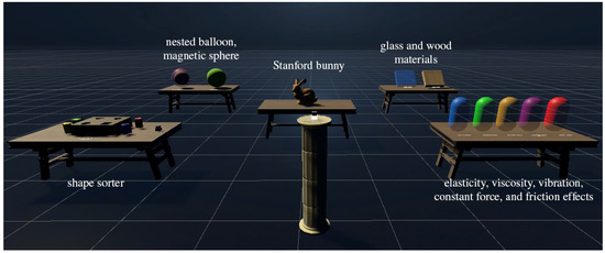 Virtual environment showcasing haptic simulation. Shape-sorting activity, two sculptures (nested balloon and a magnetic sphere), model of a Stanford bunny, glass and wood material simulation, and five distinct tactile effects.