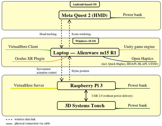 Wireless communication between the host laptop, client HMD, and the stylus allows for reduction in power delivery requirements for all the devices involved. Previously, we were constrained by the built-in battery of our host machine, a 90 Wh Li-ion battery. With several power-saving techniques in place, such as undervolting the CPU and underclocking the CPU and GPU, we achieved approximately 60 to 90 min of screen-on time. However, by eliminating the need for the user to carry the laptop, we can disable all power-saving measures, increase rendering performance output, and strive for higher texture quality and visuals while considering the limitations of the Air Link function of Meta Quest 2, rather than being restricted by the power consumption of the PC. The power delivery for the stylus device remains the same as described in Section 2.2.1, with an external power bank. However, the battery now needs to supply power to the Raspberry Pi 3 as well, which reduces the stylus’s power-on time. Previously estimated at approximately 12 h, the stylus’s system-on time can now be estimated to a maximum of about 10 h due to the added power requirements of Raspberry Pi 3. As the 10-h run-time of this system exceeds the presumed continuous session duration by a single user, we utilize this external power source to extend the battery life of Quest 2 as well. By taking into account the average power consumption of Quest 2 (between 4.7 and 7 W), Raspberry Pi 3 (between 1.3 and 3.7 W), and 3D Systems Touch (between 18 and 31.5 W), we can estimate that the entire system can be run on a single charge of a 20-ampere–hour battery for approximately 4.5 to 8 h, effectively quadrupling the minimum system up-time. Considering (as mentioned in Section 2.4) that the comfortable usability of this prototype is up to 30 min, the extended power management parameters significantly exceeded this use-case. Even if the weight reduction and ergonomic improvements described in Section 3.1 only quadruple usability time to 2 h, the power requirements would not become a significant limitation. All components of the wireless connectivity and power delivery are illustrated in Figure 4.