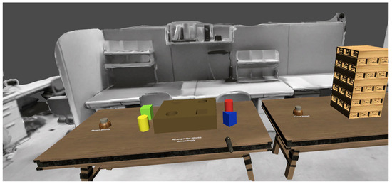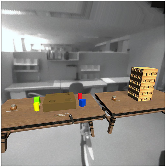 Similar to the mixed reality scene, the virtual reality scene showcases virtual Jenga and block-sorter desks. However, the seemingly real environment lacks the dynamicity that the MR provides as it is a static texture map.