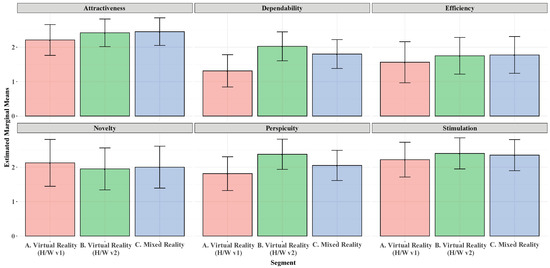 The User Experience Questionnaire (UEQ) was utilized to evaluate participants’ experiences across six dimensions: Attractiveness, Dependability, Efficiency, Novelty, Perspicuity, and Stimulation. The questionnaire responses were collected on a zero-centered seven-point scale (−3 → +3). Analysis of the UEQ data revealed that there were no statistically significant differences between the VR and MR experiences. Moreover, a comparison was made between the UEQ results obtained from the ambulatory condition in the previous experiment, which utilized the old hardware, and the VR condition in the current experiment, where the enhanced hardware was employed. The results of estimated marginal means showed no significant differences between these conditions. To calculate the estimated marginal means of the fitted linear model, we employed the “lme4” and “emmeans” libraries in the R programming language. This statistical analysis allowed us to assess the differences between treatment conditions while considering the influence of potential covariates and interaction effects, providing valuable insights into the user experience across the three conditions [26,27,28]. These results are presented in Figure 8. Furthermore, the UEQ also includes benchmarking of our results against data from 21,175 individuals who participated in 468 studies involving various products, such as business software, web pages, web shops, and social networks. Our study found that both conditions, VR and MR, performed similarly when compared to this extensive dataset.