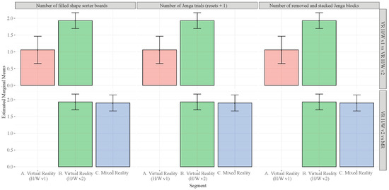 Performance measurements were analyzed similarly to the UEQ, using estimated marginal means, but with a fitted generalized linear mixed-effects model [29]. Three dimensions were considered: the maximum number of removed and stacked Jenga blocks, the number of Jenga trials (resets + 1), and the number of filled block-sorter boards. Regarding comparison between the VR and MR segments, results showed that there was no significant performance difference. However, when comparing the VR segments using the previous version of the hardware with those using the latest one, results indicated a significant difference in performance across all three metrics, favoring the revised hardware implementation. These results are presented in Figure 9.