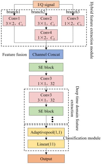 Existing studies have proved that a deeper network in the field of modulation recognition cannot improve the network performance but will increase the network parameters and calculation amount, which can result in network overfitting [29]. Therefore, we consider increasing the width of the network to improve the ability of network feature extraction and the information utilization of the original data. For the original I/Q signal (N × 2), we redesign the feature extraction part of the network, i.e., the aforementioned hybrid feature extraction module and deep temporal feature extraction module.