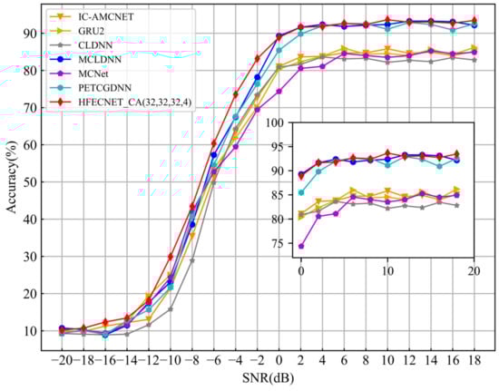 In the first experiment, to verify the superiority of HFECNET-CA model performance, HFECNET-CA (32, 32, 32, 4) was compared with six SOTA AMR models: IC-AMCNET [12], GRU2 [15], CLDNN [16], MCLDNN [17], MCNet [22], and PET-CGDNN [23]. The performance indexes compared in the experiment include the number of parameters, the test response time of a single sample, the highest recognition accuracy under all SNRs, and the average recognition accuracy under 20 SNRs.