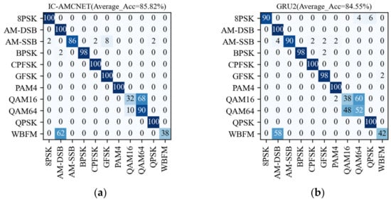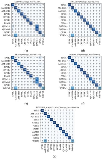 Confusion matrix of (a) IC-AMCNET, (b) GRU2, (c) CLDNN, (d) MCLDNN, (e) MCNet, (f) PET-CGDNN, and (g) HFECNET-CA (32, 32, 32, 4) on RadioML2016.10a dataset at 10 dB SNR.