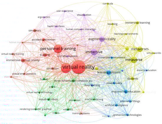 In an attempt to better organize the key topics, a clustering operation was performed. VOSviewer software identified five clusters. Clusters help to show connections between topics, aiding interpretation of the results. Line thickness indicated the strength of the topic pairs, while node size reflected keyword or topic frequency, clusters, and lines. Figure 1 illustrates prevalent subjects like virtual reality, personnel training, augmented reality, metaverse, engineering education, and industrial robots. These subjects received substantial research attention from 2011 to 2023. Keywords without network connections could develop new research areas.