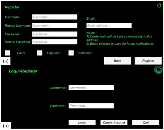 (a) GUI for the login of registered users; (b) GUI for the registration of new users in the platform.