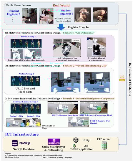 Collaborative design mixed reality case studies in the proposed platform immersive learning framework: (a) car differential; (b) virtual manufacturing cell; (c) industrial refrigerator compressor.