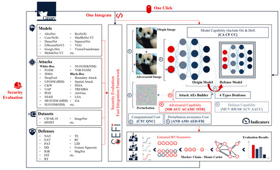 In order to comprehensively evaluate the security of deep learning models, some research [14,15,16,17,18,19,20,21,22] has proposed evaluation metrics, method libraries, and evaluation platforms. Works such as CleverHans [14] and FoolBox [15] integrated the most common attack and defense methods, but the neglect of code quality made some of them incorrectly developed or even unworkable. DeepSec [18] first proposed a series of evaluation metrics for both attack and defense methods but needed to exhaustively validate the effectiveness of these metrics and set a baseline and rank these methods based on the metrics. RealSafe [20] abandoned these metrics and instead used two complementary robustness curves as the primary evaluation metrics, focusing on the misclassification rate of attacks under different perturbation budgets. In fact, the evaluation strategy of RealSafe did not always work for attacks that limit the reduction of the misclassification rate while optimizing perturbations (e.g., Boundary Attack) or for attacks that are difficult to precisely limit the scale of perturbations (e.g., CW [23]). AISafety [22] attempted to extend the work of both. However, it neglected the universality of the evaluation metrics, and its interpretability and neuron traversal evaluation were difficult to widely adapt to models with different structures. Furthermore, almost all work evaluated only a few models (e.g., RealSafe only evaluated ResNet [24] and Inception, while DeepSec only evaluated ResNet, and AISafety only evaluated VGG [25] and WRN [26]), which left us with a lack of knowledge on the performance of attack and defense methods on models with different structures. The evaluation frameworks proposed by these works also lacked sufficient flexibility and universality in the face of new methods, thus limiting their further role.