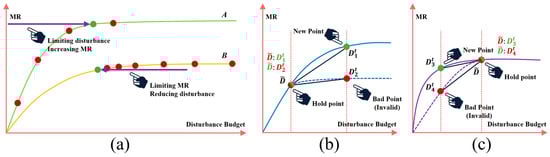 (a) The attack represented by A is to limit the perturbation to rise by iterations to reach the maximum MR under a certain perturbation limit; the attack represented by B is to limit the MR to fall by iterations to reach the minimum perturbation under a certain MR limit. For A: (b) finds appropriate example points by gradually raising the perturbation limit. If the MR changes significantly after the perturbation limit is raised, the current point is dropped, and the point that is increased after the perturbation is taken as the new point; otherwise, the current point is not changed; (c) finds the appropriate example point by gradually decreasing the perturbation. If the MR changes significantly after the perturbation is decreased, the current point is not changed; otherwise, the current point is dropped, and the point decreased after the perturbation is taken as the current point. For B: the appropriate example points can be found automatically.