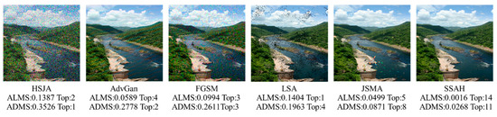 where , is the GMSD score on the jth scale, and is the weight of different scales. The lower value of ALMS indicates that the adversarial attack is less likely to be perceived by humans, and on the contrary, the higher the value is, the less imperceptible the attack is.