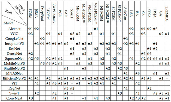 We integrate a large number of classical and SOTA attacks for bi-directional evaluation, including 12 white-box attacks and 12 black-box attacks. These attacks cover the widest range of attack paths, attack means, and distance measures, including (1) gradient-based attacks, transfer-based attacks, score-based attacks, and decision-based attacks; (2) frequency-domain- and time-domain-based attacks; and (3) attacks based on . To fully demonstrate the differences in robustness between models with different structures, we selected the 15 most representative models ranging from AlexNet [29] to ConvNeXt [30] in the evaluation. We conducted large-scale experiments with these models and methods on the ImageNet [31] dataset. Using quantitative results, we show the differences in misclassification and imperceptibility capabilities between different attack methods and further analyze the competition between them; we also show the differences in the robustness of the different structural models and, furthermore, which attack methods work better or worse against which models. We also provide a more intuitive capability score to help researchers understand the robustness of different models and the differences in the effectiveness of different attack methods more clearly.
