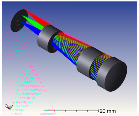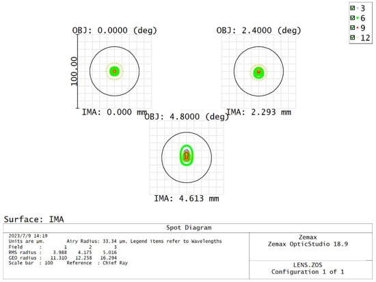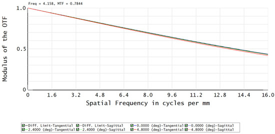 The system has a F-number of 4.5, an aperture of 16 mm, a total field of view of 9.6°, and an overall length of 50 mm. The structure of the optical system is shown in Figure 2, the transfer function (MTF) of the optical system is shown in Figure 3, and the standard spot diagrams (for the actual optical system, due to the existence of aberrations, after all the light emitted by an object point passes through the optical system, the intersection point with the image plane is no longer a point, but a diffuse spot, which are called standard spot diagrams) is shown in Figure 4. The optical system has good imaging quality, and the MTF value is close to the diffraction limit, which fully meets the airborne requirements.