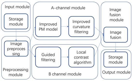 (1) Improved PM filtering only—only the background information is weakened, and the details and edges are enhanced.