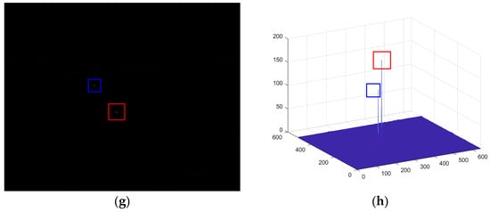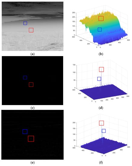 In hazy weather, there is smoke, dust, water vapor, and other media in the air, which have a diffusing effect on the light. The outline of the target is no longer clear, and some of the details are not shown. In the background of haze, the weak targets are submerged in the high-brightness background, and the conventional image processing algorithms cannot recognize the weak targets. In order to further verify the usefulness of the proposed algorithms in this paper, a classical infrared small-target image with haze and a city as the background was selected, processed, and analyzed. Figure 7 shows the processing and results of the sequential experiments. There was a bright target and a dark target in the original image, and the bright target is shown in the red box, while the dark target is depicted in the blue box.