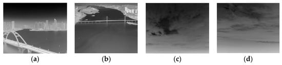 The experimental dataset included 9000 infrared images with weak targets. We used a UAV-mounted optical system and infrared detection designed to acquire infrared small targets from the air during the month of May, targeting river boats, automobile paintings on bridges, cars and buildings on the ground, as well as a portion of the airborne small-target imagery from the ground, targeting airborne airplanes and flying birds. Figure 8 shows a portion of the infrared images used in this experiment for qualitative and quantitative comparisons of different methods.