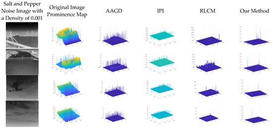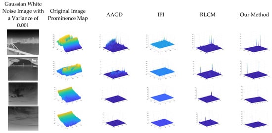 To assess the effect of noise on the performance of our method, the above experiments were repeated in the presence of salt and pepper noise. Figure 10 and Figure 11 show the detection results of the test images with the addition of salt and pepper noise with a density of 0.001 and Gaussian noise with a variance of 0.001, respectively. Table 1 demonstrates the average values of the detection data for each method in this dataset. From these images, it can be seen that the algorithm of this paper shows the best performance in the face of noise, and it can be concluded that the presence of noise has little effect on the performance of this method.