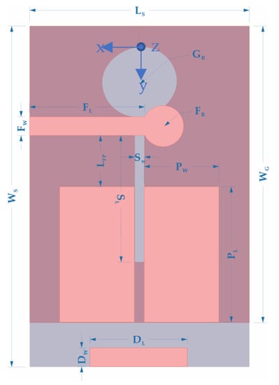Figure 1 shows the geometry of the antenna, along with its dimensions and parameters, which are listed in Table 1. The antenna consists of a microstrip feedline of width Fw and length FL, which connects to a radial stub of radius FR. The etched slot of width Sw is of length SL + Fw, and it is etched on the ground plane perpendicularly to the feeding section, where its end is terminated by the circular ground slot of radius GR. The two patches of length and width PL × PW are placed above the ground plane side by side, separated by the distance of slot width. The director of length DL and width DW is placed in front of the two rectangular patches so that the radiation becomes more directive at a higher frequency in the X-band. The simulated return loss of the antenna with and without the patches and director is shown in Figure 2a. From the figure, we can see that the patches not only assist in electromagnetic wave radiation but also contribute to the impedance matching of the antenna system. The first and second resonance frequencies of the fabricated antenna can be estimated by using the following equations, as given in [].