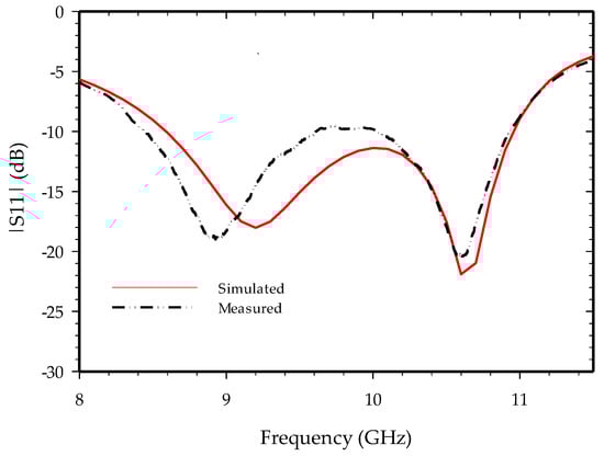 The simulation and measured results are shown in Figure 3. The figure shows the impedance bandwidth, where |S11| < −10 dB, varies from 8.5 to 11 GHz. The resonance frequencies are at around 8.9 and 10.5 GHz. The slot length, followed by the patch length, contributes to the lower-frequency resonance, whereas the diagonal length of the patch contributes to the upper-frequency resonance. The simulated and measured return loss vary significantly, which can be attributed to the connection losses, faulty soldering, and fabrication flaws.