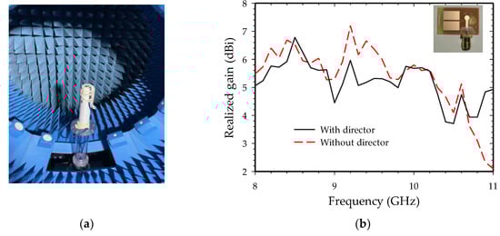 Measurement setup and the gain of the proposed antennas: (a) radiation pattern measurement in the anechoic chamber; (b) measured realized gain.